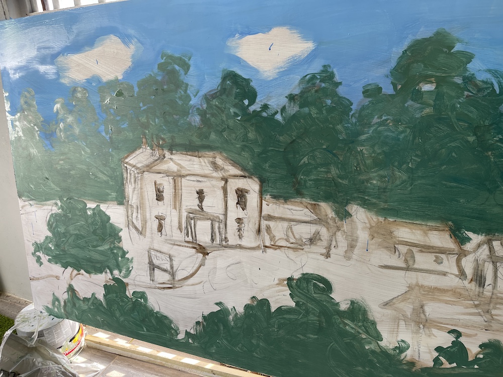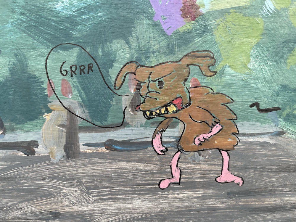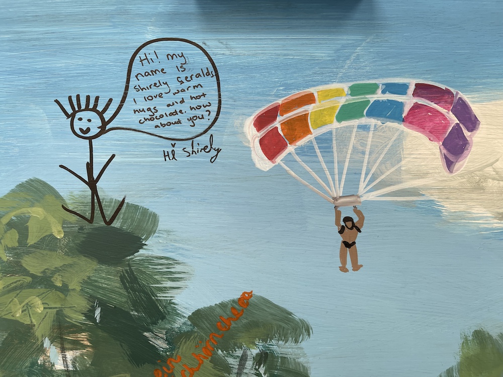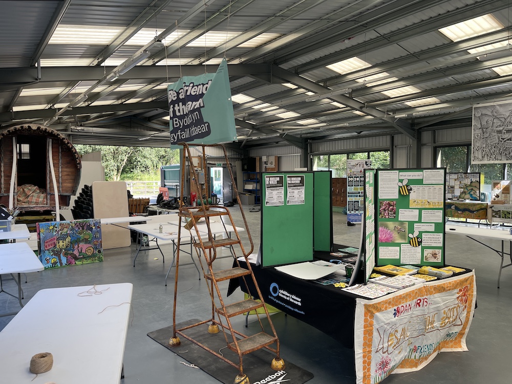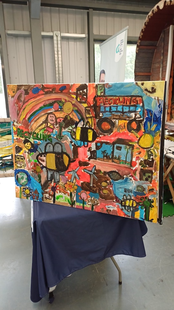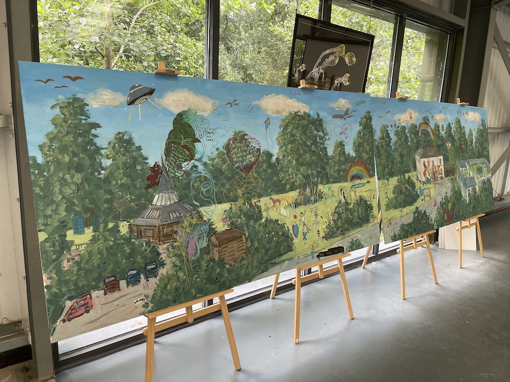 Several mural workshops were done for the festival, the first in preceding months with the Mary Immaculate Primary in Haverfordwest, exploring sustainable futures, and the second on a mural at the festival itself. I painted in a simple background scene of the park and Manor House, and children and adults alike came and filled in the content of dynamic figures and delightful comic inventions – a few of the many great drawings, done with acrylic ink pens, are below!