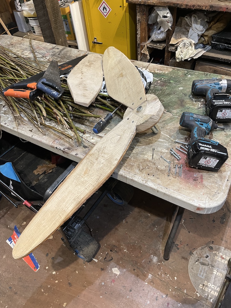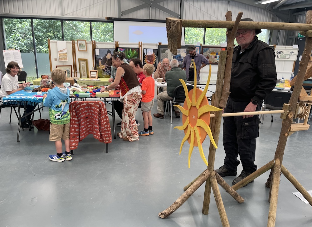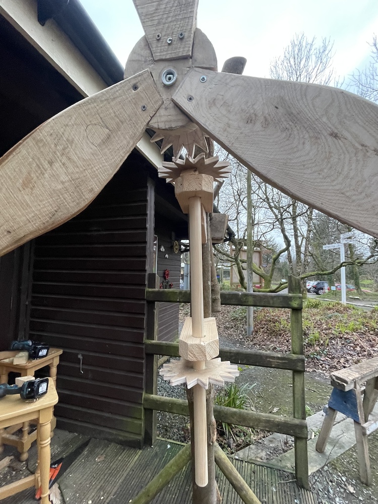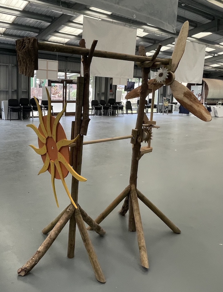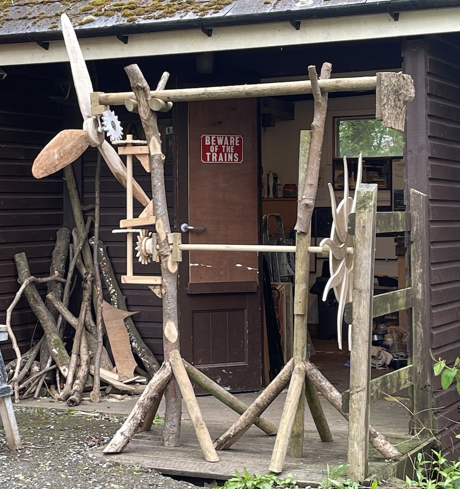 This was a piece the manager of Scolton Manor, Mark Thomas, and I agreed would make an interesting model feature for our planned festival. I began the work in December 2024, collecting together pieces of wood from the edge of the park among the timber from its fir trees and fallen ash. It was then a question of ad hoc work, as and when it was possible for me to come in to Scolton and do a few hours of work on the piece. Gradually it came together, and by the time of the event it made a reasonably well-functioning piece of interactive sculpture – most of its components recycled Scolton wood, with the exception of screws and odd metal fixings. It had a small space allocated to it, very close to the overhanging banner with the title ‘Tilting at Windmills’!