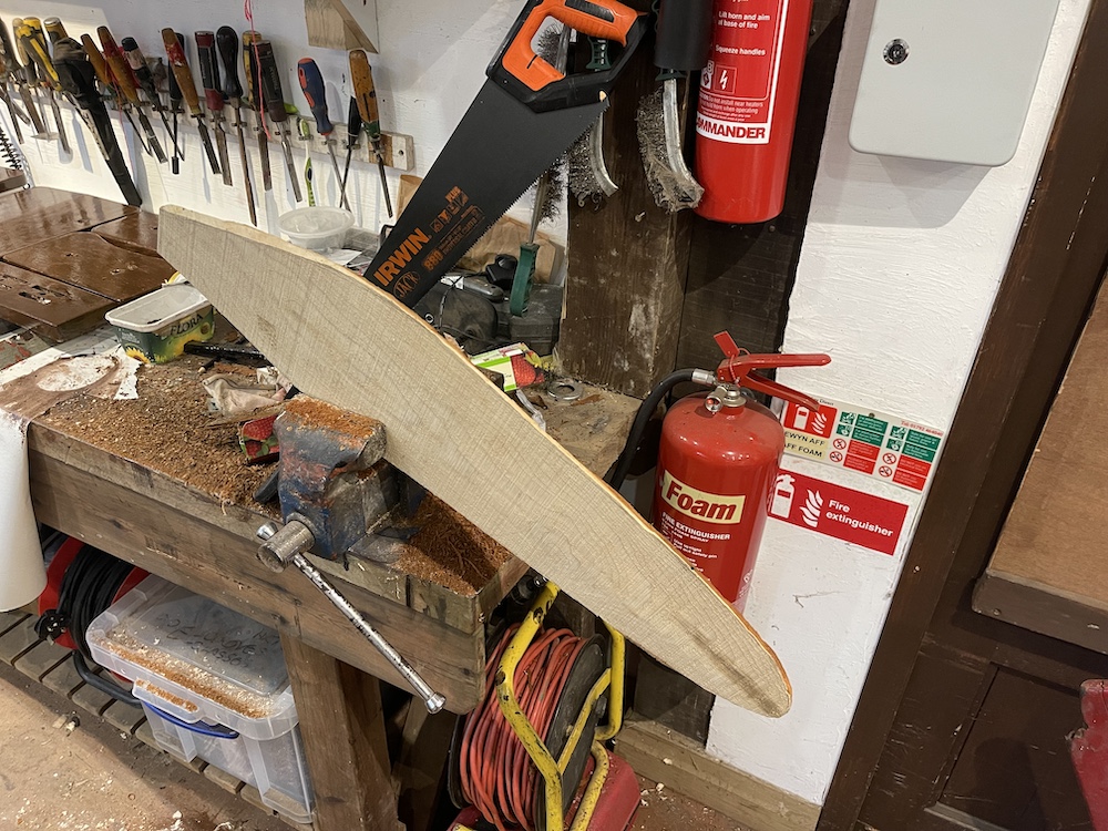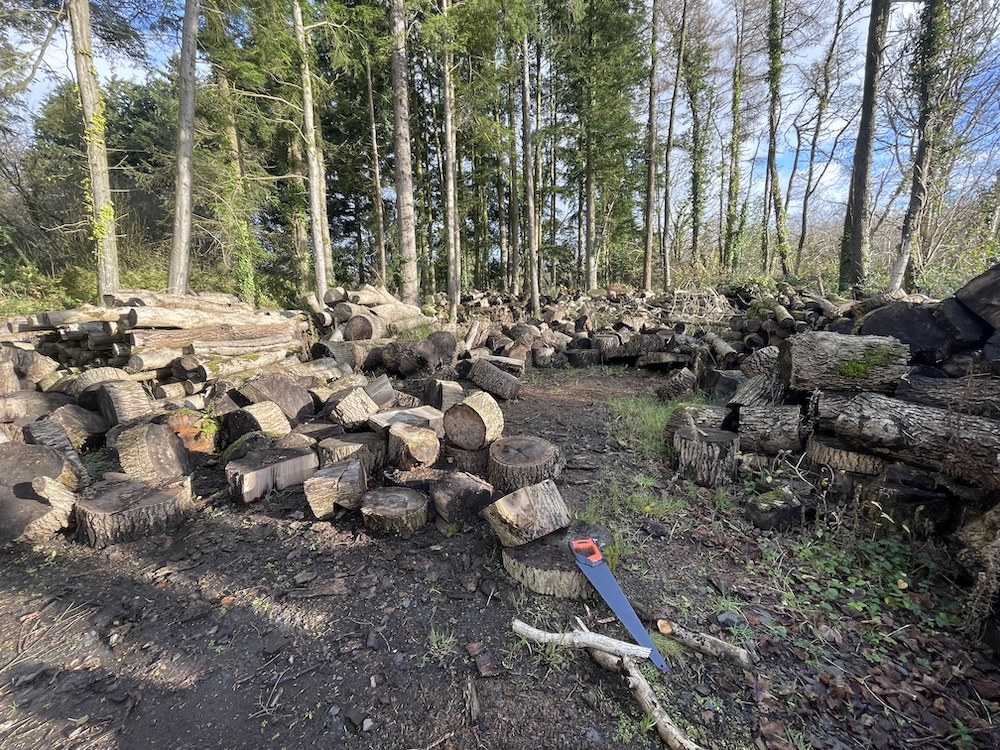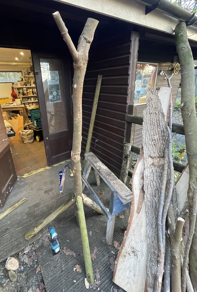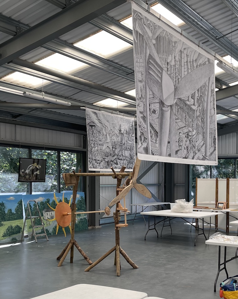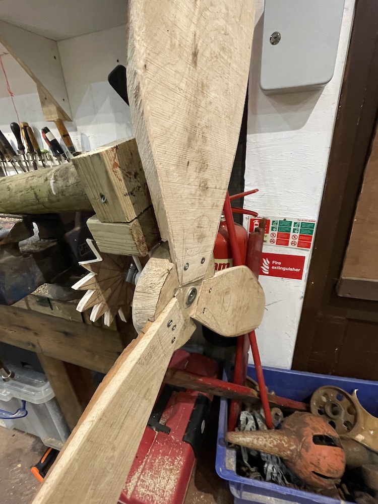 This was a piece the manager of Scolton Manor, Mark Thomas, and I agreed would make an interesting model feature for our planned festival. I began the work in December 2024, collecting together pieces of wood from the edge of the park among the timber from its fir trees and fallen ash. It was then a question of ad hoc work, as and when it was possible for me to come in to Scolton and do a few hours of work on the piece. Gradually it came together, and by the time of the event it made a reasonably well-functioning piece of interactive sculpture – most of its components recycled Scolton wood, with the exception of screws and odd metal fixings. It had a small space allocated to it, very close to the overhanging banner with the title ‘Tilting at Windmills’!