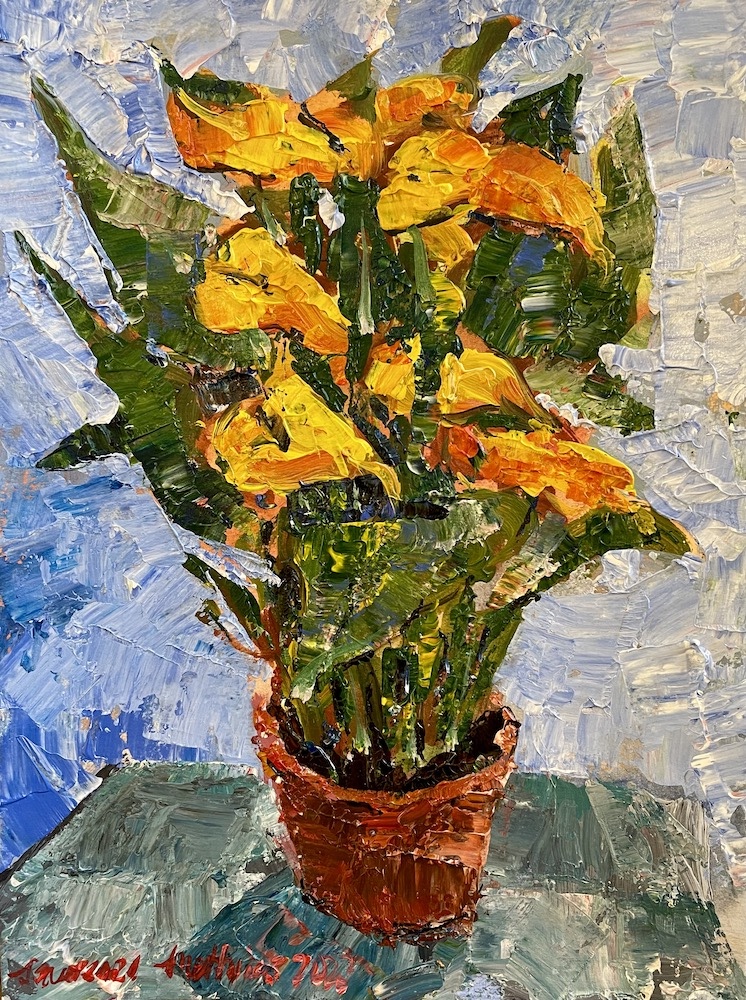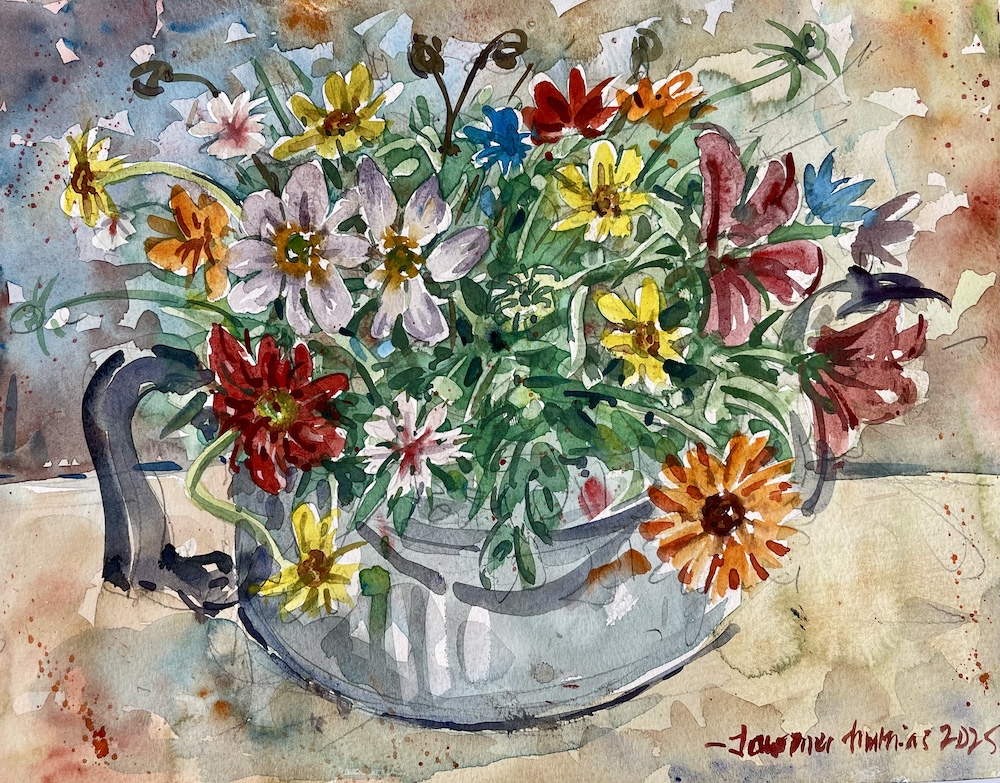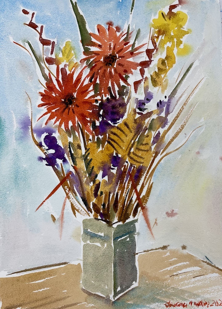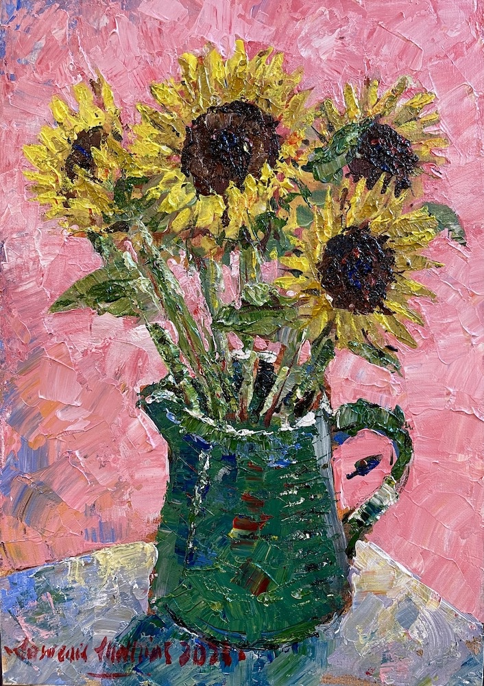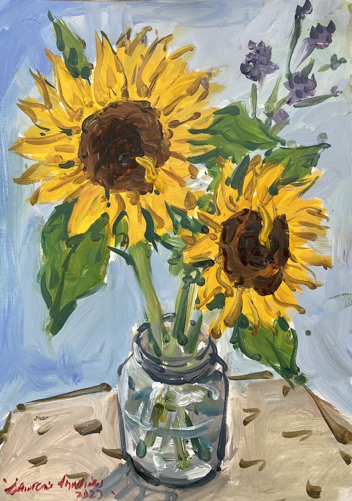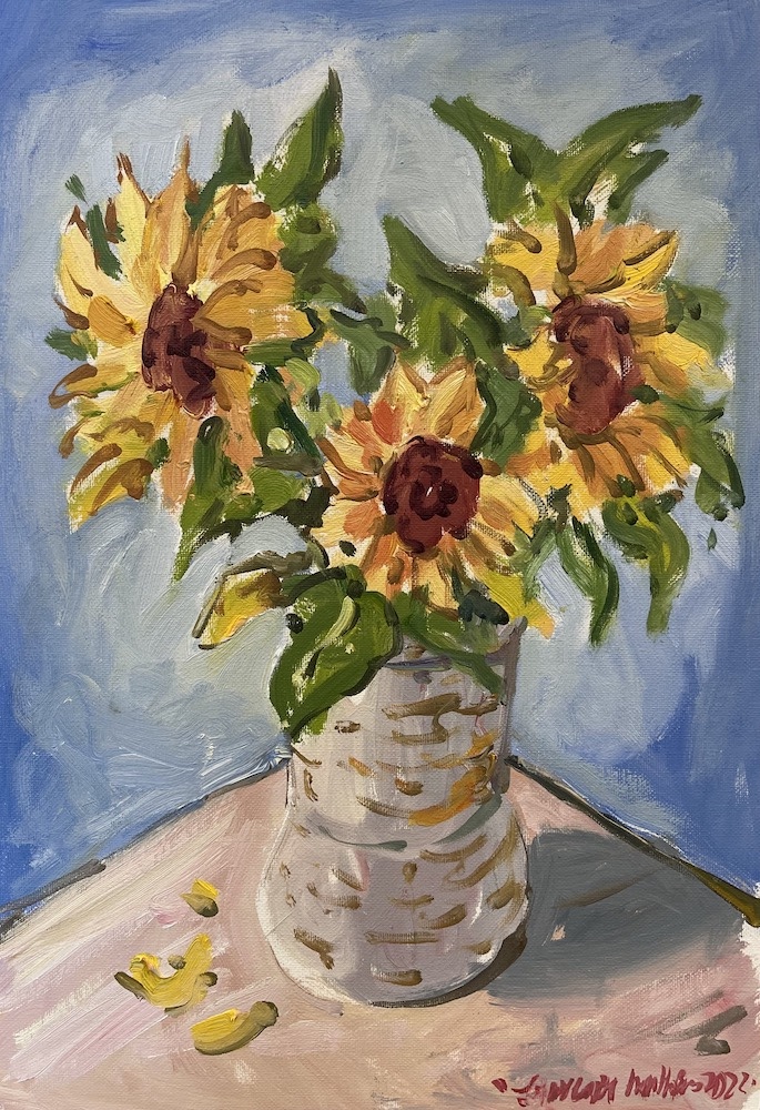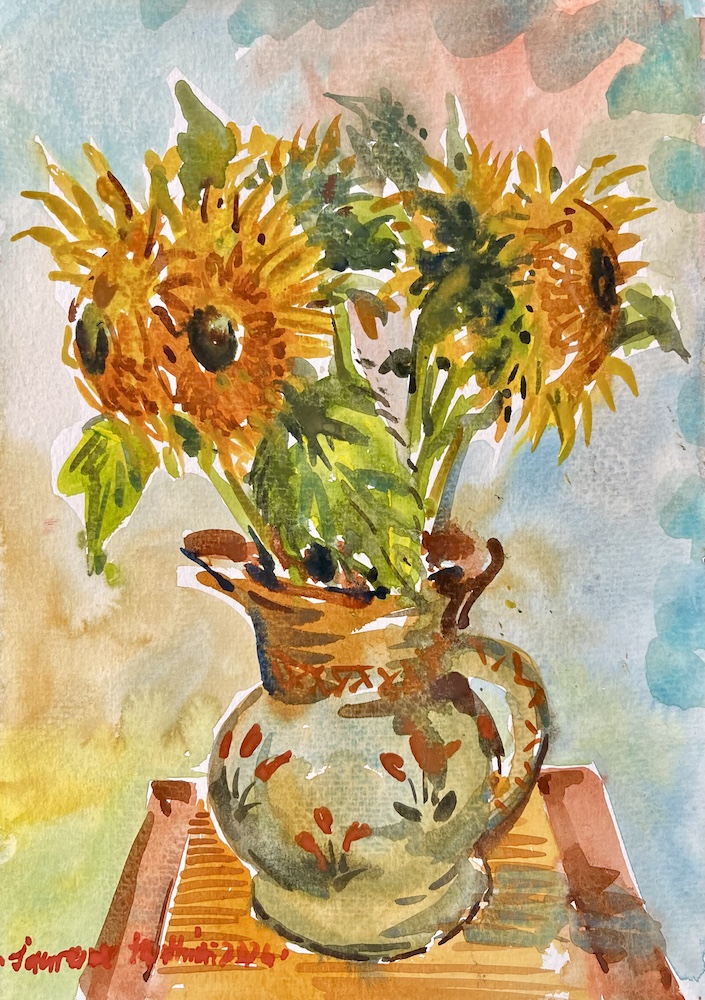 Sunflowers, by and large, a plentiful flower in the shops and stores, but always fascinating and lovely to paint. These are a mixture of oils, acrylics and watercolours